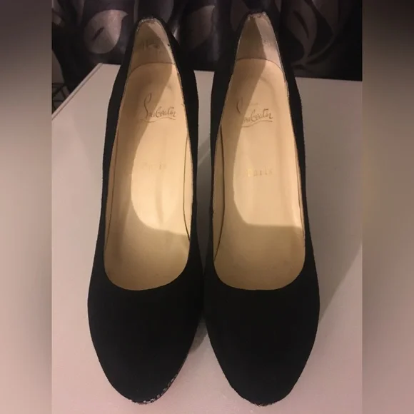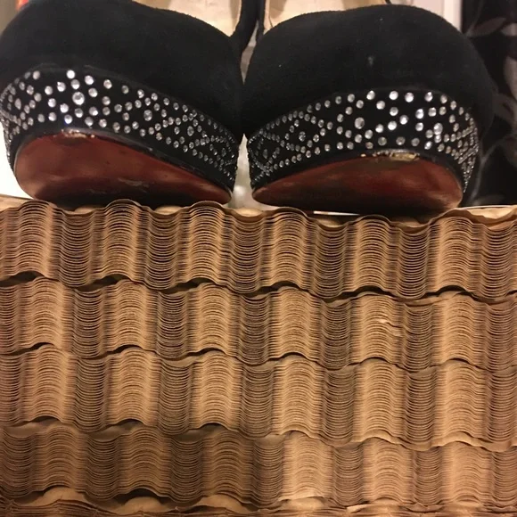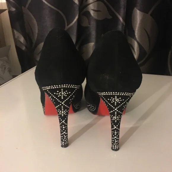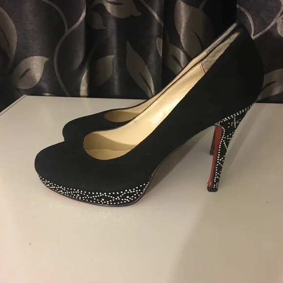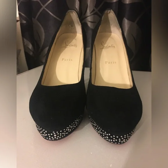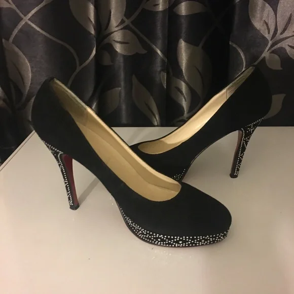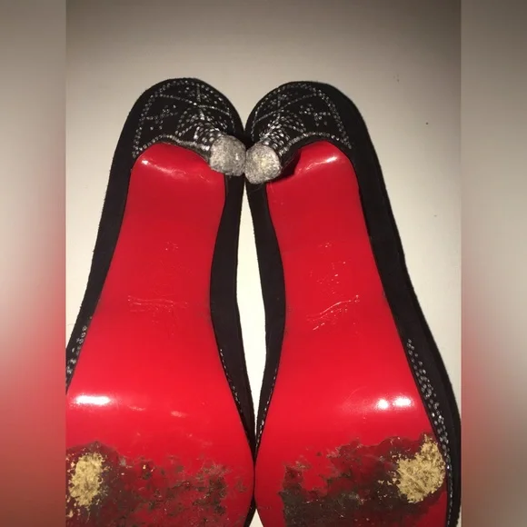 Christian louboutin women size 41 US 10.5 Eugenie Crystal Suede Rhinestone heels•Suede detailGorgeous pumps made with suede and embellished with Rhinestones at heelsRetail over $1500They have been worn has scuffs at the toe shown in photo Size 41 EuropeInsole is 10.25”Heel -6”I recommend to know your size in Louboutins ,because they runs smaller half to whole size