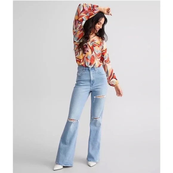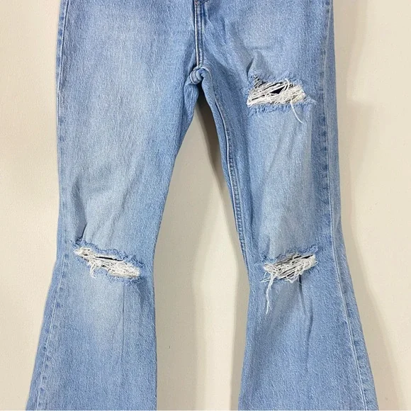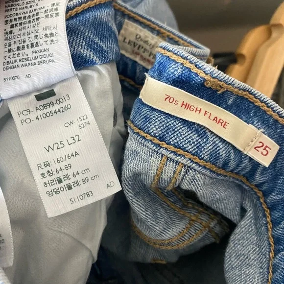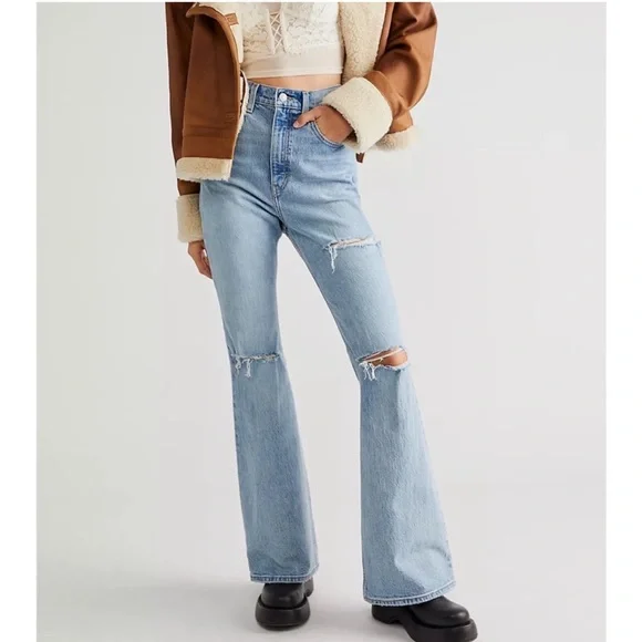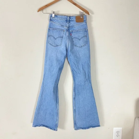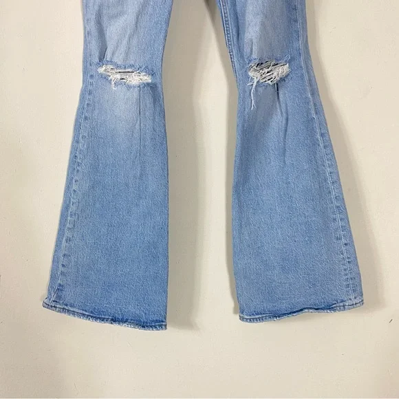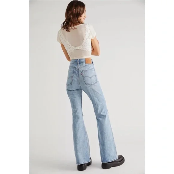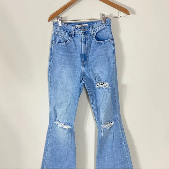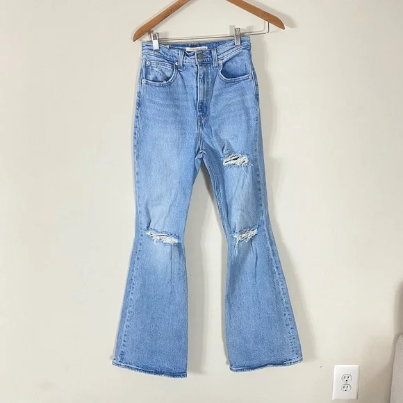 PRE-LOVED, GENTLY WORNLevi’s 70's High Rise Flare in “You and I” Light WashAn ultra high rise jean that is fitted through the hip and thigh and the perfect amount of destruction.Ultra high riseStretch fabricFitted through the hip and thigh13" bottom openingDestruction details99% Cotton, 1% Elastane.Machine wash cold. Do not bleach. Tumble dry low. Low iron. Professional dry clean.GOOD CONDITION shows light wear. No damages/stains!
